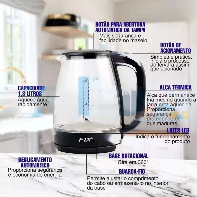 Esta jarra elétrica moderna não só aquece a água mais rápido que um microondas ou fogão, mas também adiciona um toque de elegância com seu design em vidro e luz LED indicativa. Em poucos minutos, você terá água quente pronta para o uso, com a segurança do sistema de desligamento automático que evita desperdício de energia. A jarra, feita de vidro seguro que não libera substâncias químicas, garante sua saúde, enquanto a alça fria protege suas mãos de queimaduras. A base removível facilita o manuseio e o serviço, tornando essa jarra elétrica a escolha perfeita para sua casa. Adquira já a sua e desfrute de mais praticidade e segurança ao preparar suas bebidas quentes favoritas!