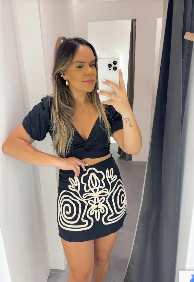 Esse conjunto é perfeito para as festas de fim de ano! Feito com um tecido leve que mistura viscose e poliamida, ele oferece frescor e caimento impecável. O short saia é todo bordado com cordas e vem com um cinto que valoriza a cintura. O cropped tem nó frontal e mangas bufantes, com elástico nas costas para maior conforto. O zíper nas costas do short saia garante o ajuste perfeito. Não perca essa peça única!
