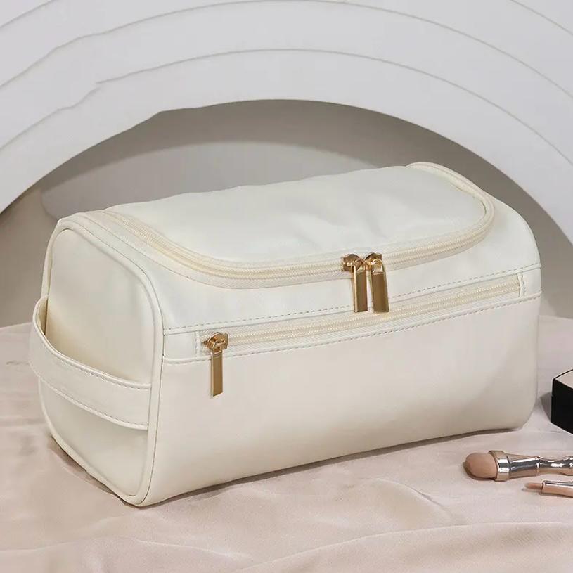 A Necessaire de viagem à prova d'água é ideal para organizar sua maquiagem e produtos de higiene. Com dimensões de 25x14x13cm, oferece amplo espaço para todos os seus itens. Feita de couro PU e malha, é durável e fácil de limpar.