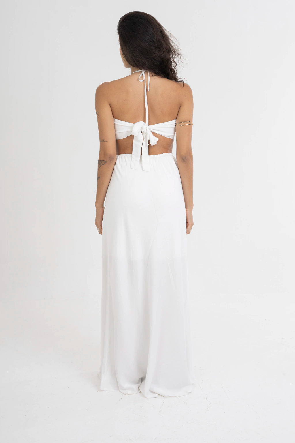 O Vestido Gávea une frescor e estilo com leveza. Feito em sarjada de viscose, é longo, fluido e possui amarrações nas costas e pescoço. Sem bojo e sem transparência, é perfeito para qualquer ocasião